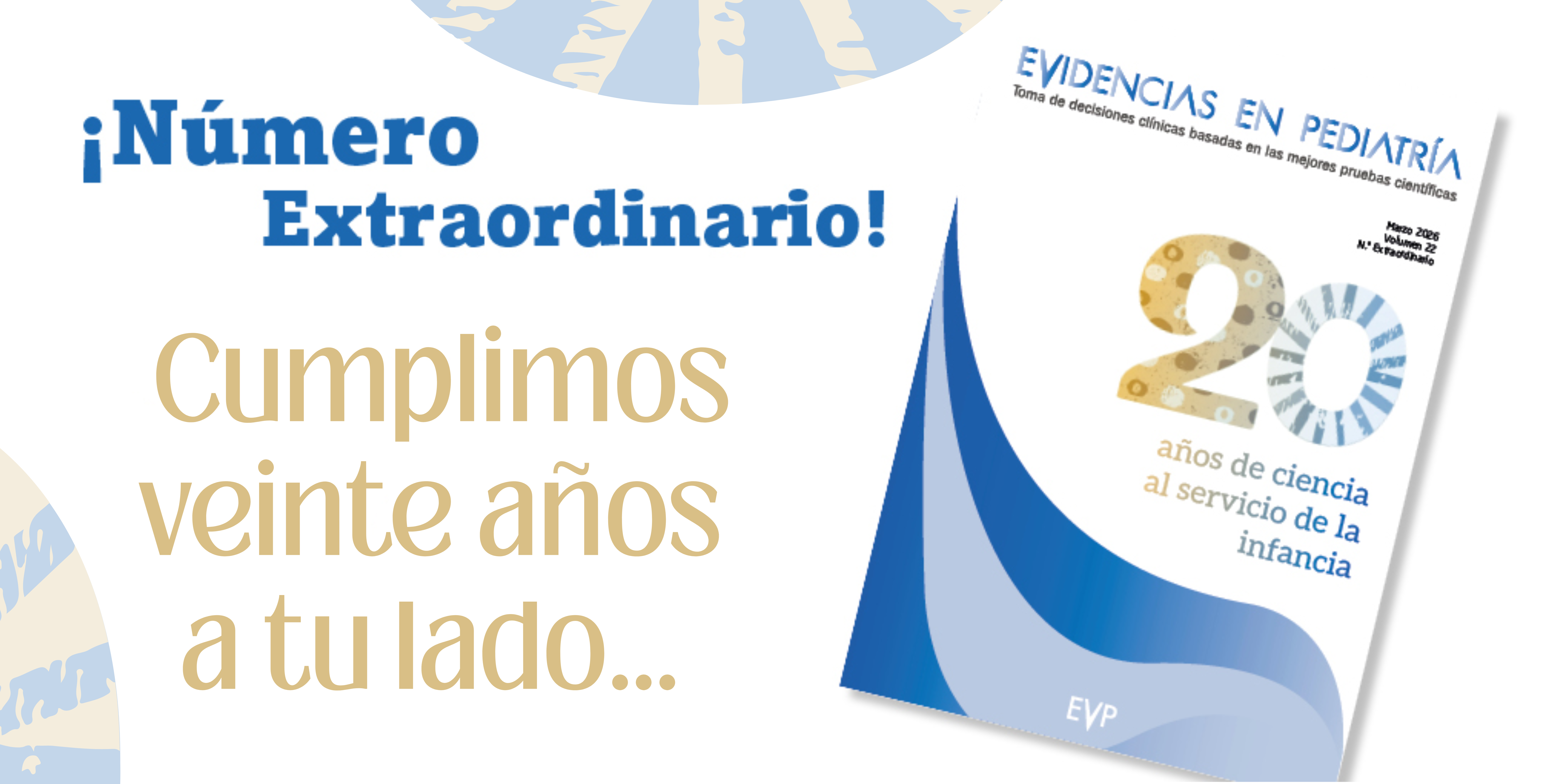 Aunque el sitio Web www.evidenciasenpediatria.es está dirigido mayoritariamente a profesionales de la salud, la información médica visible en su área pública es de libre acceso para cualquier usuario. Por ello, queremos aclarar que el uso de estos contenidos por parte de la población no reemplaza en ningún momento la relación entre el médico y el paciente. Para obtener información específica sobre un caso concreto, consulte siempre a su médico.